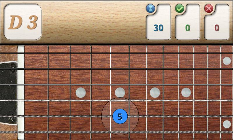 There is also a second game available, 'play'. The game presents a note (including octave number). The goal is to position the note correctly on the fretboard.
