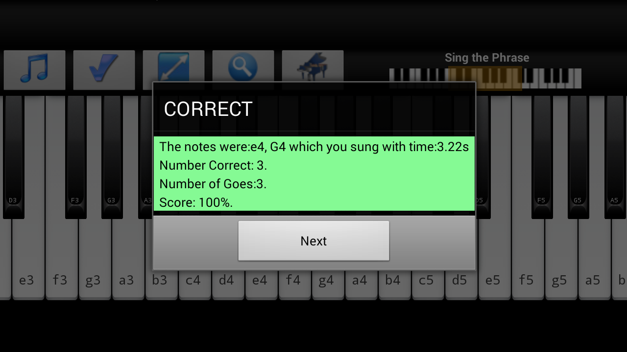 App plays a note or phrase of notes, and you sing to it.The piano keys highlight showing which note you should sing and which pitch you are correctly singing. Keep track of progress and gain stars for great singing.Designed in collaboration with professional singing teacher.Exercises to expand your... see more